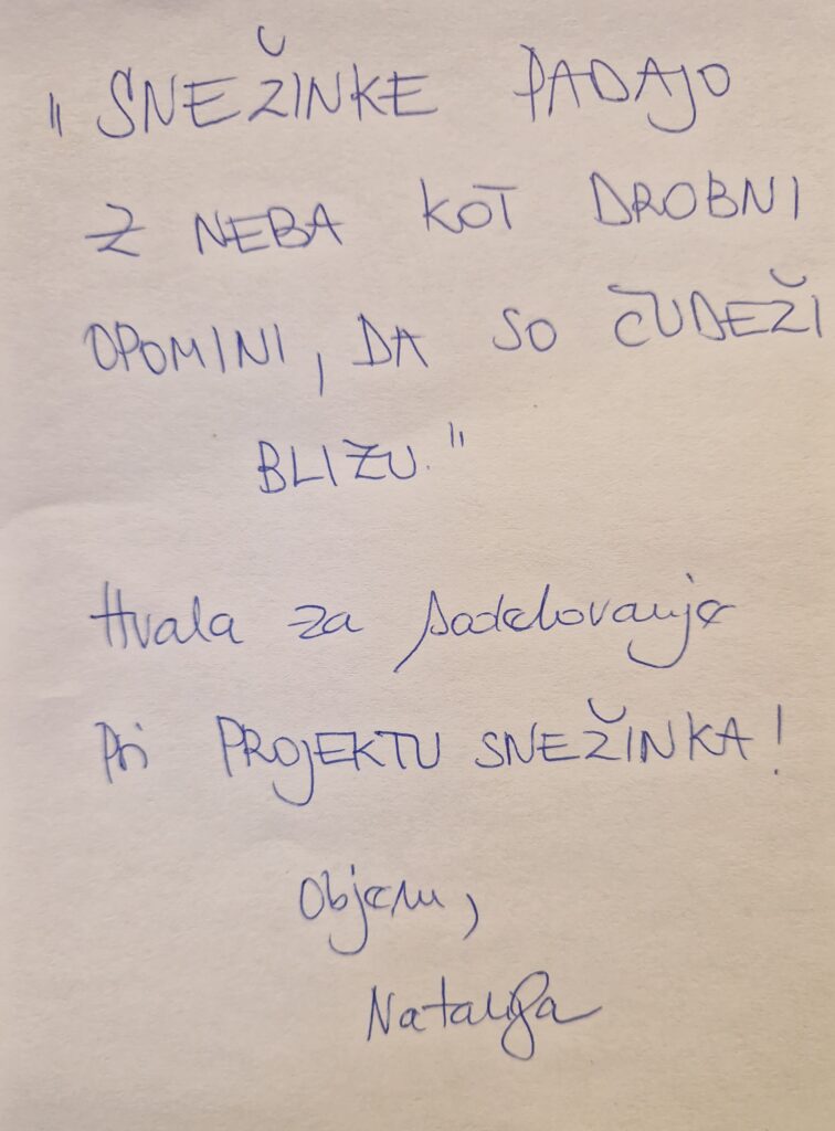 Naj prinesejo upanje in mir v naša srca.Tudi mi, ljudje, smo kot snežinke…razIičnih barv, velikosti, oblik … tako različni, a vsak prelep na svoj, edinstven način.